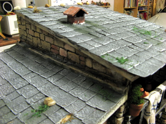 Tejado ya terminado. Las tejas han sido pintadas de un color gris y posteriormente repasadas con pincel seco en color blanco. Se complementa con detalles como musgo, hiervas, piedras y por supuesto la chimenea hecha con poriexpan.